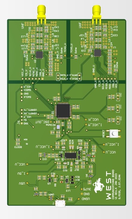 PCB design for Western Engineering Satellite Team's communication subsystem. Features two AX5043 transceivers and an STM32 MCU.